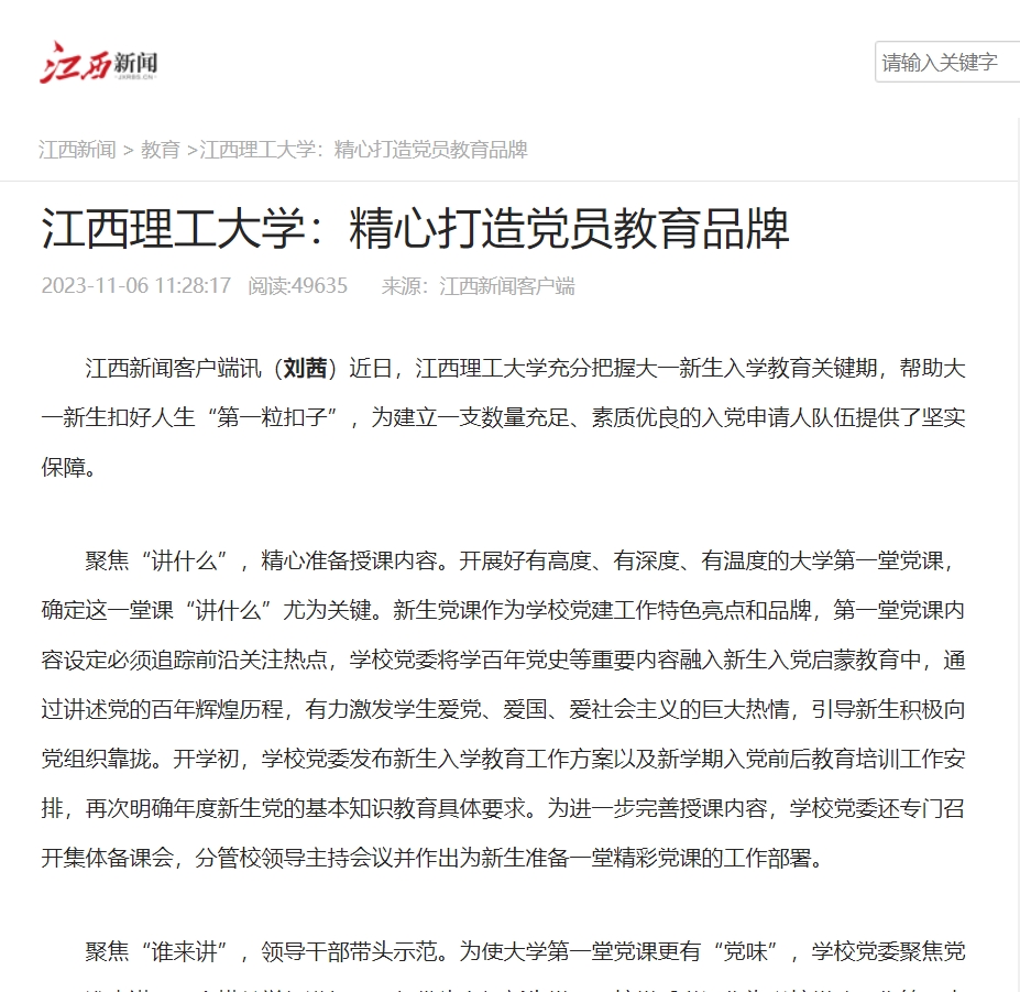 坚持久久为功,着力打造大学第一堂党课教育品牌,2021年结合党史学习教育,充分把握大一新生正处在人生“拔节孕穗期”,精心开展大学第一堂党课活动,有关经验做法被新华网、江西教育网等媒体广泛宣传报道,并得到江西省教育系统党史学习教育简报专版推介(第65期)。