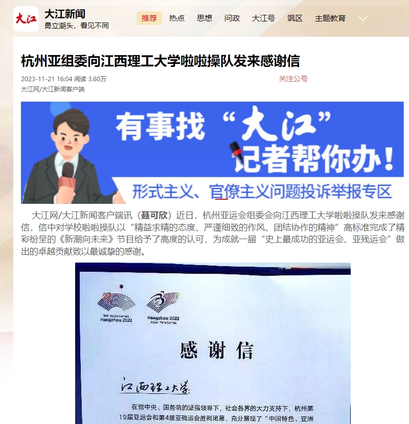 啦啦操队发来感谢信,信中对学校啦啦操队以“精益求精的态度、严谨细致的作风、团结协作的精神”高标准完成了精彩纷呈的《新潮向未来》节目给予了高度的认可,为成就一届“史上最成功的亚运会、亚残运会”做出的卓越贡献致以最诚挚的感谢。