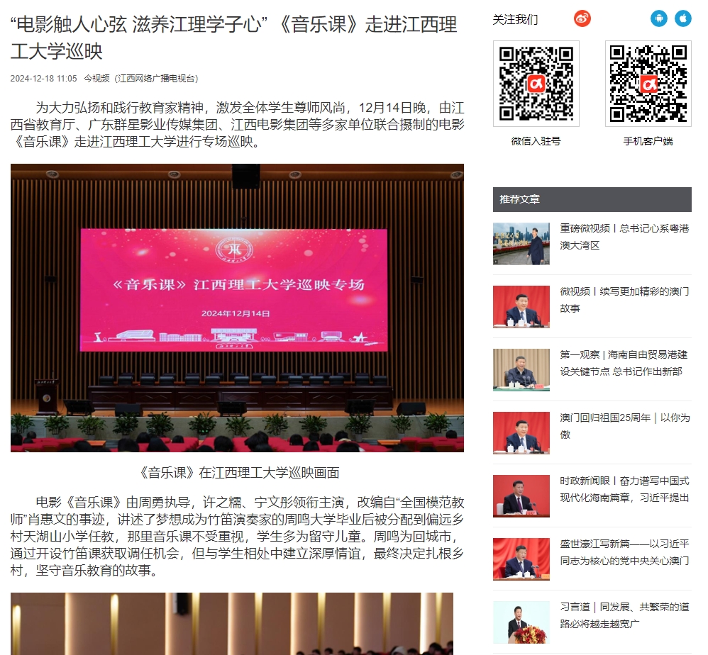 为大力弘扬和践行教育家精神,激发全体学生尊师风尚,12月14日晚,由江西省教育厅、广东群星影业传媒集团、江西电影集团等多家单位联合摄制的电影《音乐课》走进六合彩开奖