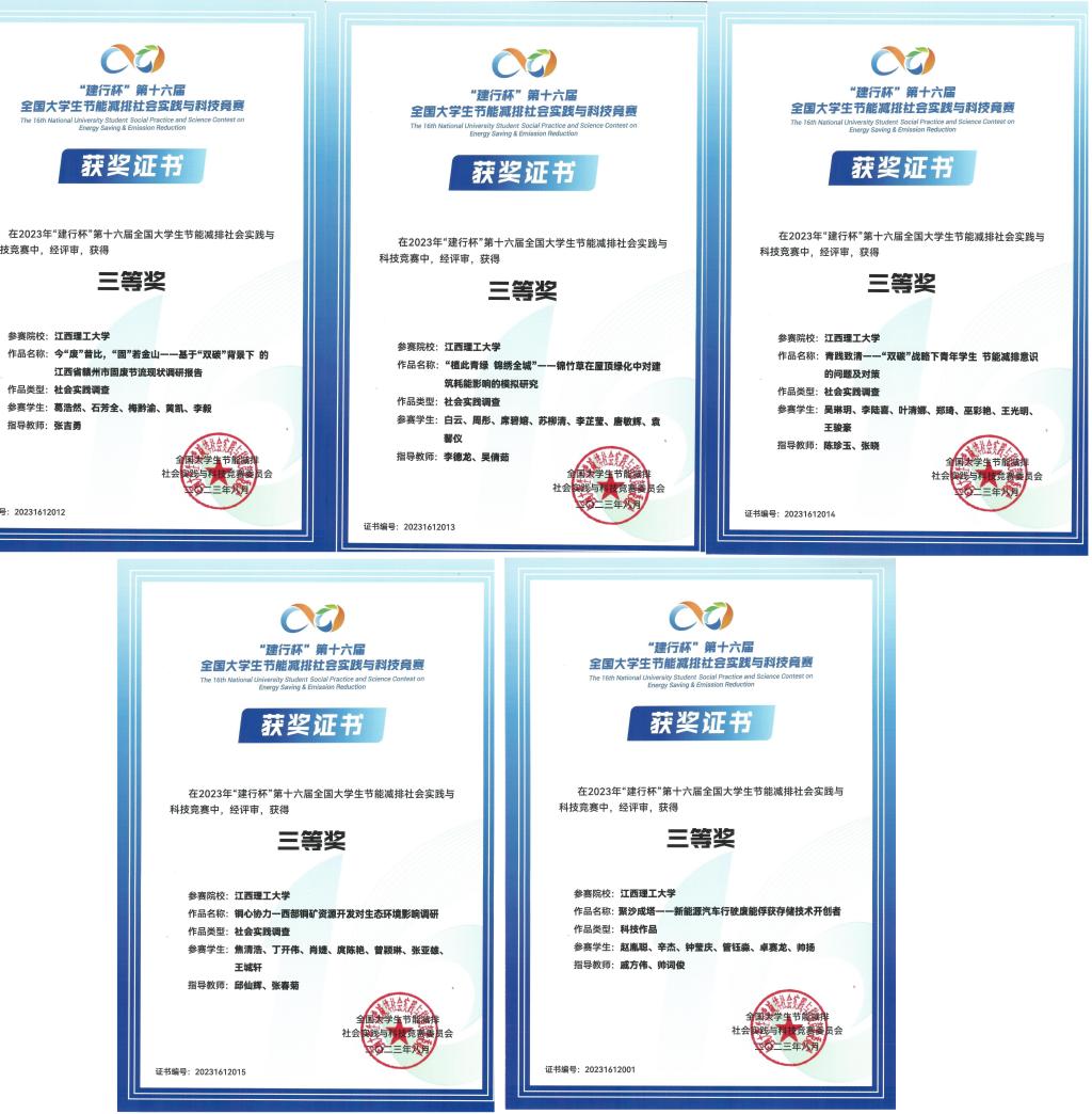 能源与机械工程学院赵胤聪等同学的《聚沙成塔——新能源汽车行驶废能俘获存储技术开创者》(指导老师:戚方伟、帅词俊)获得科技作品类三等奖;资源与环境工程学院葛浩然等同学的《今“废”昔比,“固”若金山——基于“双碳”背景下的江西省赣州市固废节流现状调研报告》(指导老师:张吉勇)、法学院白云等同学的《“植此青绿 锦绣全城”——锦竹草在屋顶绿化中对建筑耗能影响的模拟研究》(指导老师:李德龙、吴倩茹)、马克思主义学院吴琳玥等同学的《青践致清——“双碳”战略下青年学生节能减排意识的问题及对策》(指导老师:陈珍玉、张晓)、资源与环境工程学院焦清浩等同学的《铜心协力—西部铜矿资源开发对生态环境影响调研》(指导老师:邱仙辉、张春菊)获得社会实践调查类三等奖。