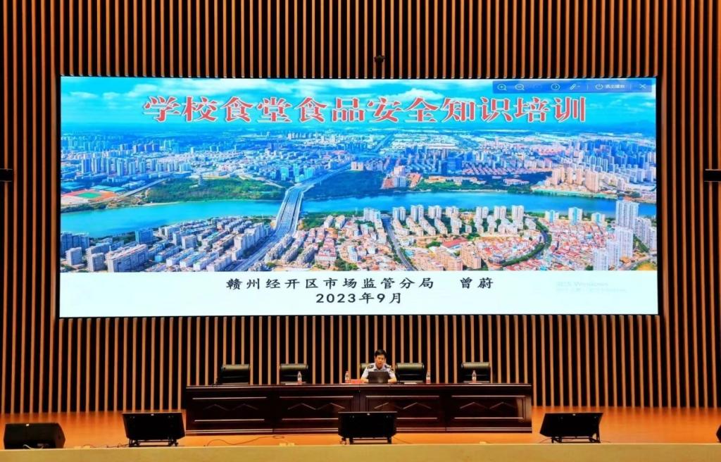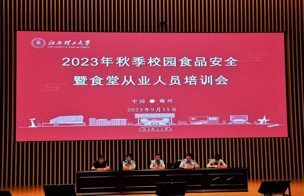 2023年秋季校园食品安全暨食堂从业人员培训会在三江校区志远报告厅举行。培训会特邀赣州市经开区市场监管分局分管食品安全党组成员肖晖、经开区市场监管分局科技城市监所所长汪昊、经开区市场监管分局食品安全股股长曾蔚以及航天信息股份有限公司赣南片区总工程师张佺参会。校园服务与校产中心膳食管理人员,红旗校区、三江校区食堂管理人员和员工,以及江西环境工程职业学院、赣州职业技术学院、赣州经开区技工学校院校的食堂管理人员及员工代表共计400余人参会。会议由校园服务与校产中心主任许海主持。