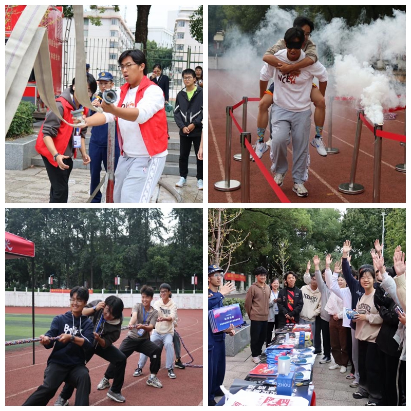 趣味比赛共设置了穿消防服甩水带、穿越火线、拔河、知识竞答四个项目。同学们四人一组,齐心协力完成一系列项目,活动现场互动热烈,气氛活跃。