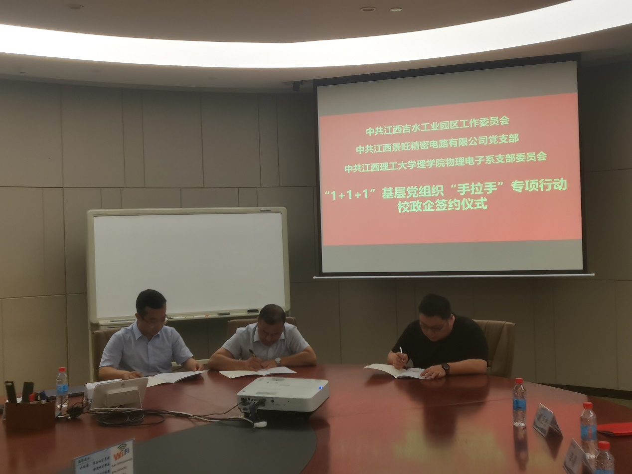 本网讯  5月14日,六合彩开奖 理学院物理电子系党支部联合吉水工业园区党工委、江西景旺精密电路有限公司党支部开展“1+1+1”基层党组织“手拉手”专项行动暨校政企合作专项行动。理学院党委书记周茂平、理学院院长徐中辉、理学院党委副书记钟晓辉等人参加活动。