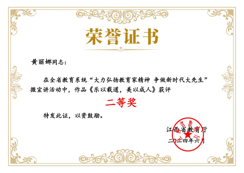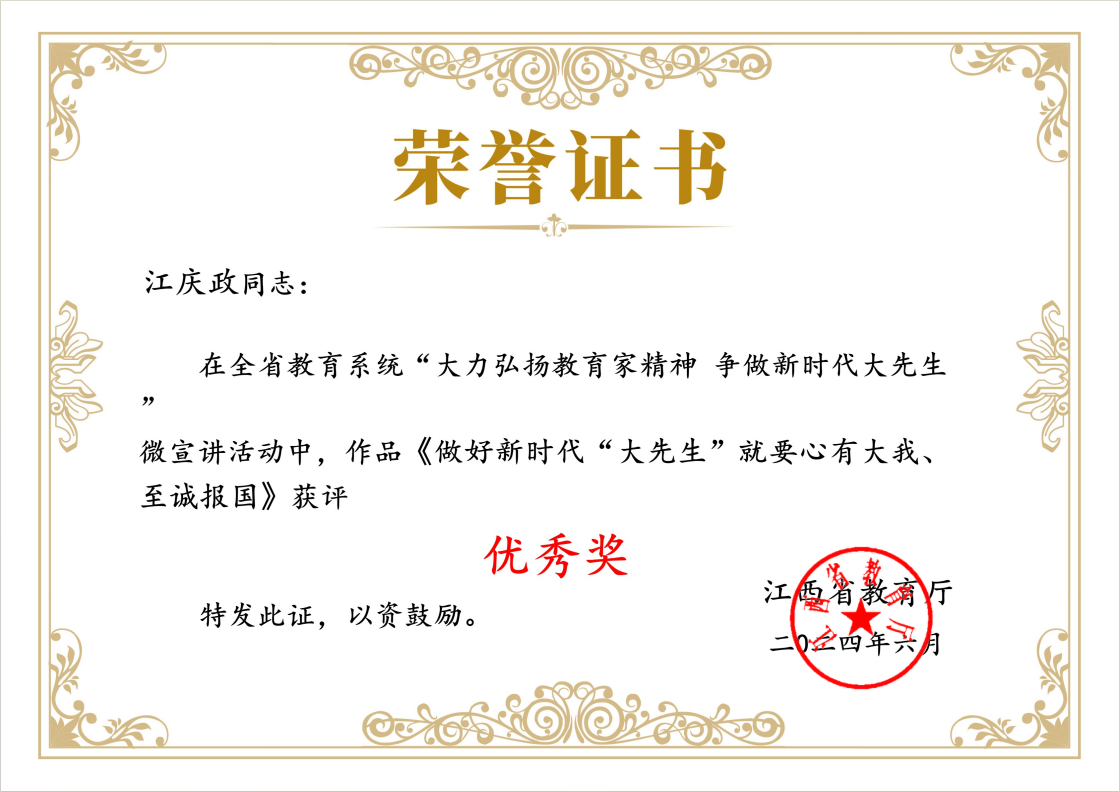 本网讯 近日,由省委教育工委组织的全省教育系统“大力弘扬教育家精神,争做新时代大先生”微宣讲视频征集活动获奖名单揭晓,六合彩开奖 体育与艺术学院教师黄丽娜的作品《乐以载道,美以成人》荣获二等奖,稀土学院教师江庆政的作品《做好时代“大先生”就要心有大我,至诚报国》荣获优秀奖。两个作品生动展示了六合彩开奖 教师在教育教学过程中的创新实践,体现了六合彩开奖 教师对教育家精神的深刻理解和实践追求。