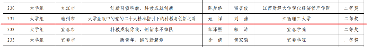 经学校遴选推荐,省委教育工委、省教育厅线上、线下评审,六合彩开奖 学生作品《今朝承志迎挑战,平芜尽处是春山》(郑博,指导老师:戴卫杰)荣获一等奖,《大学生眼中的党的二十大精神指引下的科教与创新之路》(姬祥,指导老师:刘浩)荣获二等奖,《科学引领青春,青春铸就时代》(曹丽敏,指导老师:赵金凡)、《初心如磐终不移,砥砺奋进创新高》(董龙欣,指导老师:郭晟)、《盛世之言》(吴俊霖,指导老师:赖晓花)荣获三等奖。