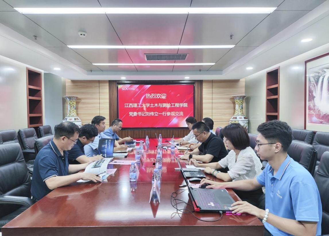 本网讯  7月3日,土木与测绘工程学院党委书记刘传立带领测绘地信系副主任敖建锋,测绘地信系刘陶胜、程小龙等教师前往广州南方测绘集团调研交流。南方测绘集团副总裁、教育事业部总经理郭宝宇,江西赣州分公司教育事业部总监徐钢及南方测绘集团教育事业部团队陪同。