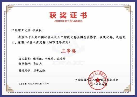本网讯  近日,第二十六届中国机器人及人工智能大赛全国决赛于宜兴落下帷幕。经过激烈的角逐,由信息工程学院易见兵、曹锋老师指导的三支队伍全力拼搏,不惧挑战,最终崭露锋芒,分别斩获机器人应用赛(城市道路识别)全国一等奖、全国二等奖、全国三等奖;人工智能创新赛全国三等奖。