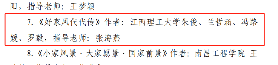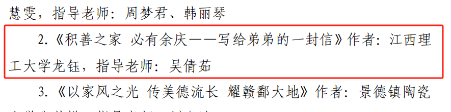 经学校遴选推荐,专家组评审,法学院学生龙钰作品《积善之家 必有余庆——写给弟弟的一封信》(指导老师:吴倩茹)荣获征文作品二等奖,经济管理学院学生朱俊、兰哲涵、冯路媛、罗毅作品《好家风代代传》(指导老师:张海燕)荣获家风故事作品三等奖,建筑与设计学院学生孙宇涵作品《清廉家风古今存》(指导老师:郭文瞻)荣获书法作品三等奖。